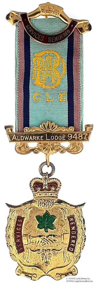 КОЛОДКИ/МЕДАЛЬОН: верхняя колодка в форме рогов буйвола с перекинутой лентой красной эмали с надписью Services Rendered. Нижняя колодка в форме ленты на фоне стилизованного орнамента с наименованием и номером Ложи Aldwarke Lodge 9487.