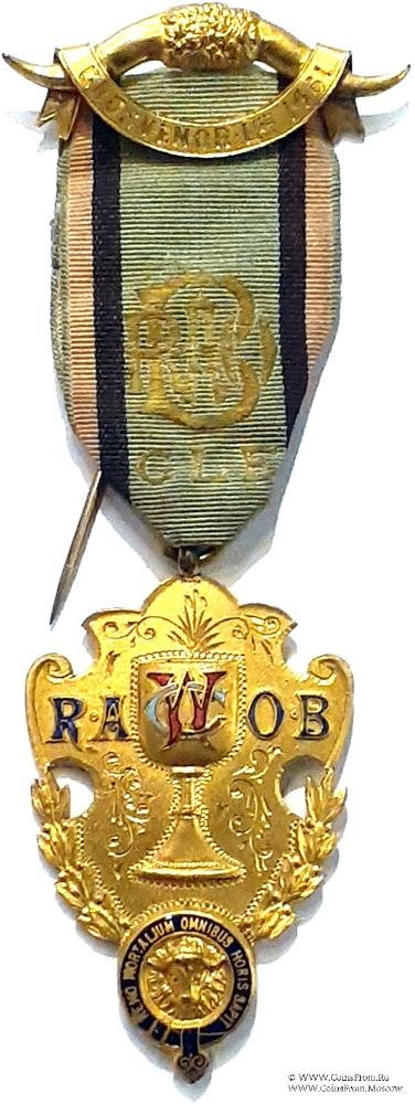 ЛЕНТА: применяемая на знаках должностных лиц Ложи, серого цвета с коричневой и розовой полосой с каждой стороны. По центру ленты вышивка с аббревиатурой ордена RAOB GLE. Ширина 30 мм.