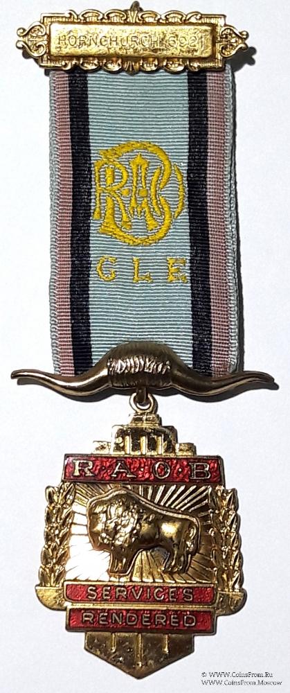 Знак на ленте голубого цвета с розовой и коричневой полосой по бокам с вышивкой аббревиатуры Ордена RAOB GLE. Верхняя колодка в форме прямоугольника на фоне орнамента с наименованием и номером Ложи (HORNCHURCH 6921). Нижняя колодка в форме рогов буйвола.