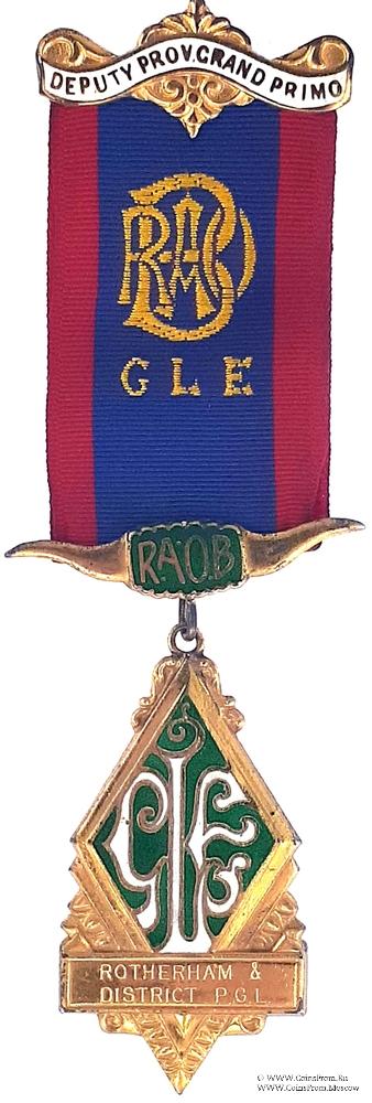 АВЕРС: в виде ромба с бело-зелёной вязью. Внизу ромб украшен орнаментом и пересекается лентой с наименованием провинции Rotherham & District P.G.P.