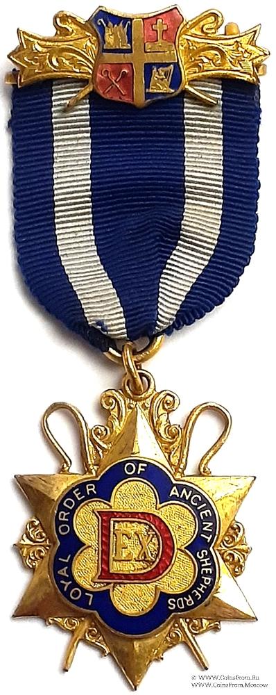 АВЕРС: шестиконечная звезда на фоне орнамента с перекрещенными посохами. В центре накладной шести лепестковый цветок. По краю цветка на синей эмали название Ордена: Loyal Order of Ancient Shepherds. В центре цветка буквы DEX.
