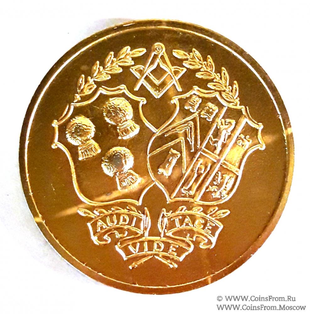 Аверс Жетона слегка выпуклый с двумя щитами - элементами гербов. Справа герб Великой Ложи Англии, слева герб Графа Честер (этот титул с 1301 г. Присваивается только принцам Уэльским, наследникам английского престола). Ниже щитов на ленте с ветвями девиз ВЛА на латыни AUDI, VIDE, TACE – слушай, смотри и молчи. Сверху щитов в ветвях акации наугольник и циркуль. В углу наугольника 4 точки.
