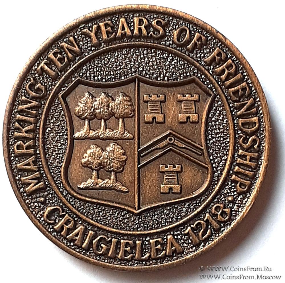 Аверс: круглой формы с буртиком от гурта. Диаметр 28 мм. В центре малый герб в виде щита. В двойном круге надпись: Marking ten years of friendship Craigielba 1218 - Празднование десяти лет дружбы Craigielea 1218.