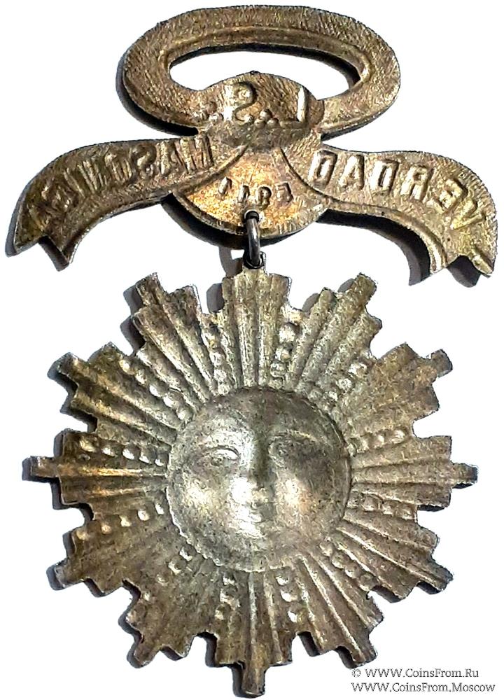КОЛОДКИ/МЕДАЛЬОН: верхняя колодка металлическая в форме петли из ленты с надписью VERDAD MASONICA – Масонская Правда. Между концами ленты цифра 5911. обозначающая год. В символических Ложах применяется календарь/Аверс №9/ “ANNOLUCIS” (AL) – «год Света», ведущий отсчёт от произнесения «творцом» слов «да будет Свет». При исчислении дат по этому календарю к году новой эры прибавляется 4000 лет. 5911-4000=1911 год. Данный знак датирован 1911 годом. Выше цифры в овале буквы L S, каждая с тремя точками. Три точки с буквой – знак аббревиатуры, указывающие, что буквы являются инициалами Масонского титула. Верх знака заканчивается петлёй для крепления либо колодки, либо нашейной ленты.