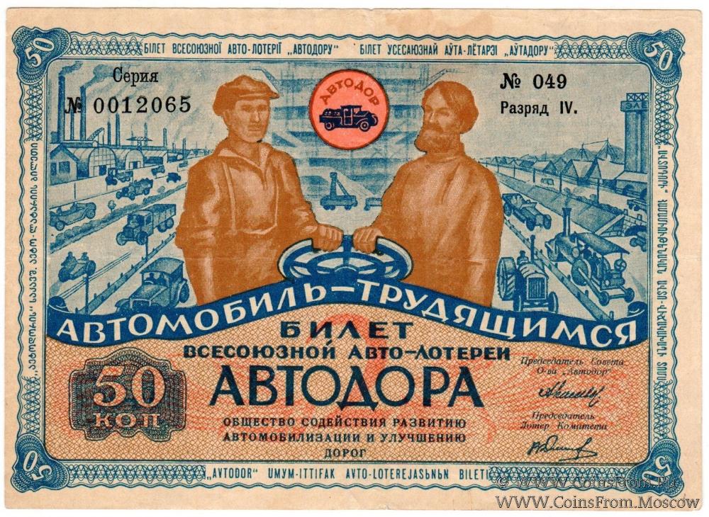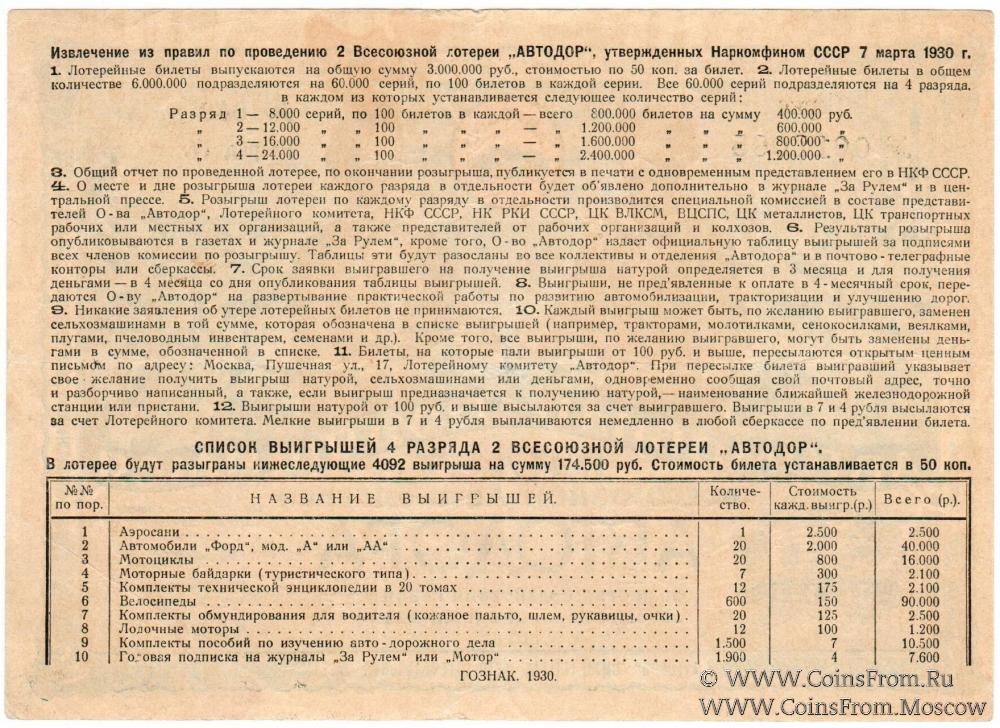 Билет авто-лотереи. IV разряд. Голубой фон и рамка. 2-я Всесоюзная авто-лотерея 1930 г.