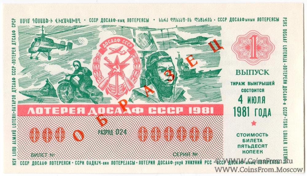 Билет. Выпуск 1. Типографская надпечатка красного цвета по диагонали "ОБРАЗЕЦ". Лотерея.