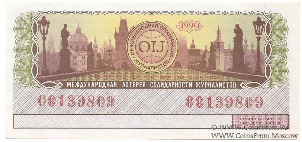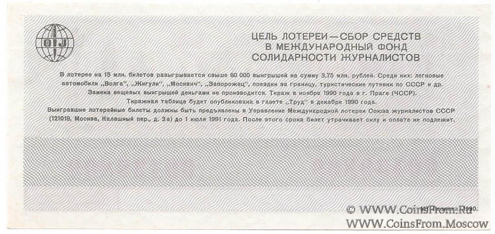 Билет. Водяной знак. Тираж в г. Праге (ЧССР). Международная лотерея солидарности журналистов.