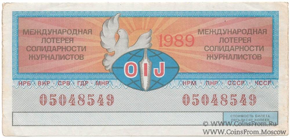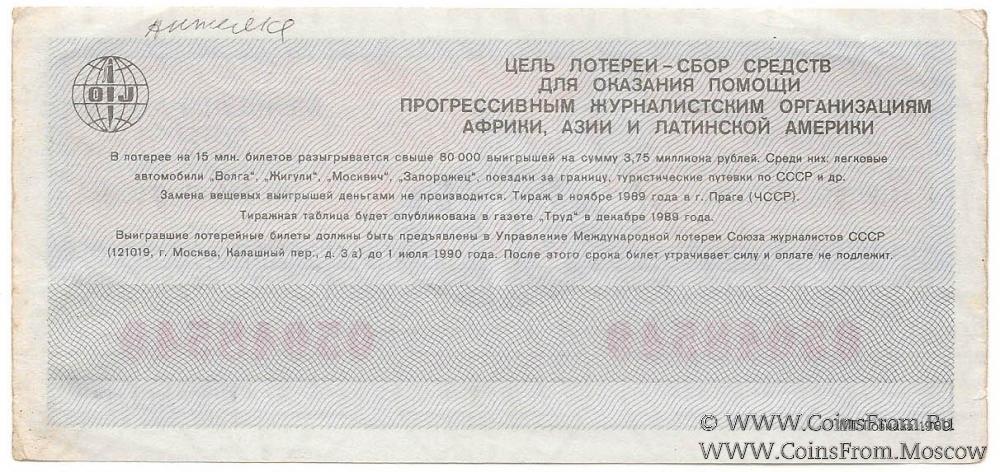 Билет. Водяной знак. Тираж в г. Праге (ЧССР). Международная лотерея солидарности журналистов.