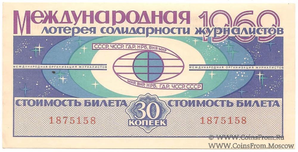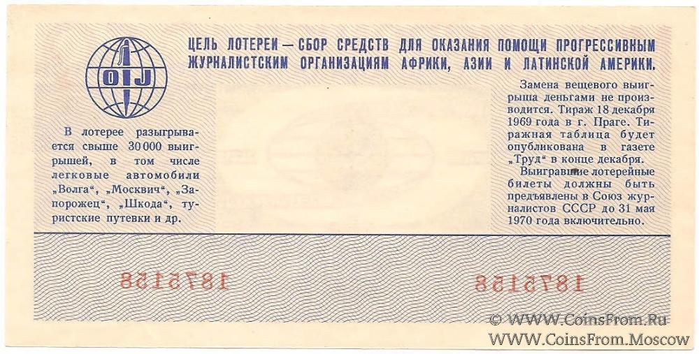 Билет. Водяной знак. Тираж в г. Праге (ЧССР). Международная лотерея солидарности журналистов.