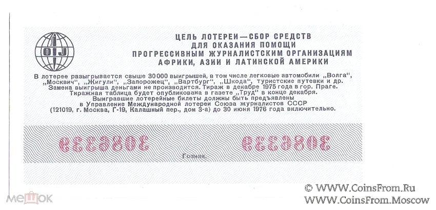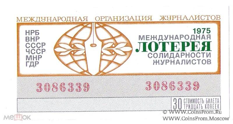 Билет. Водяной знак. Тираж в г. Праге (ЧССР). Международная лотерея солидарности журналистов.