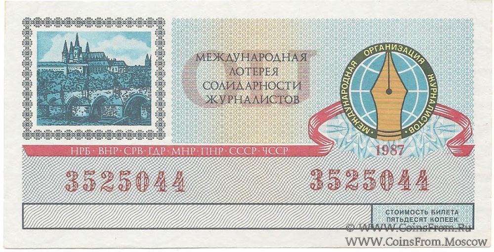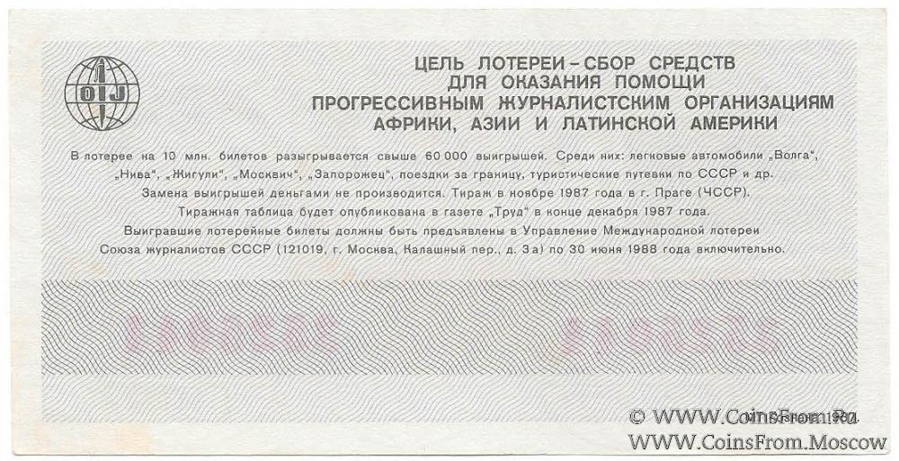 Билет. Водяной знак. Тираж в г. Праге (ЧССР). Международная лотерея солидарности журналистов.
