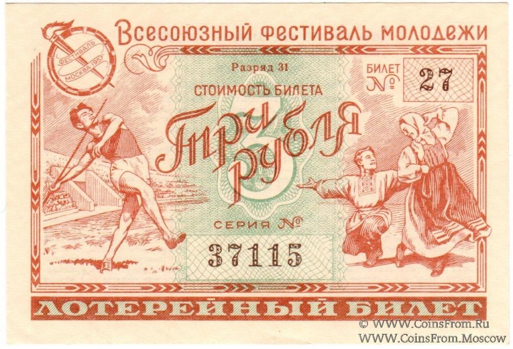 Лотерейный билет. Денежно-вещевая лотерея "Всесоюзный фестиваль молодежи". Москва, 1957 г.