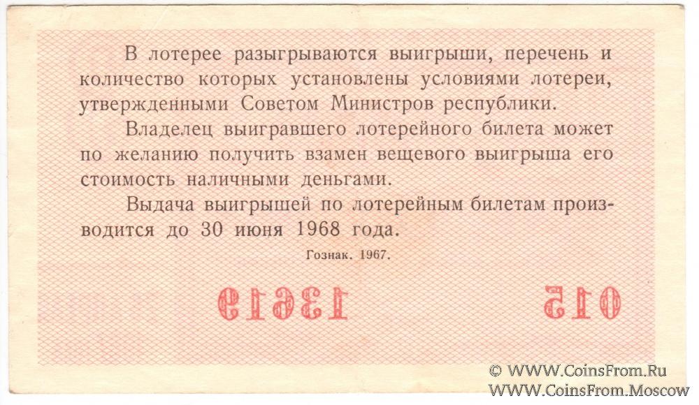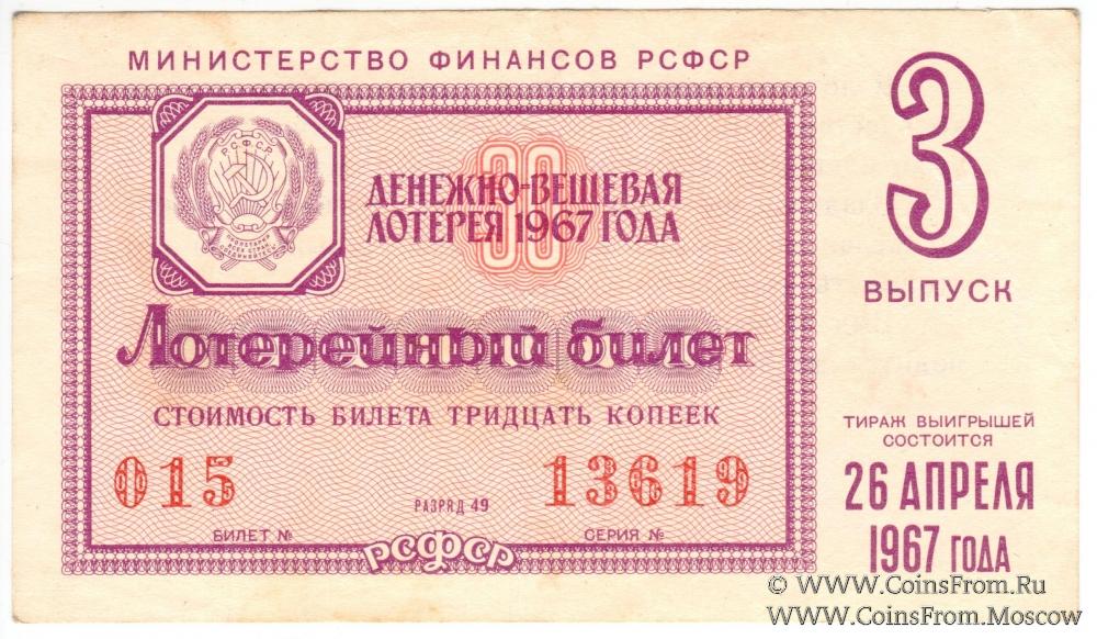 Лотерейный билет. Выпуск 3. Денежно-вещевая лотерея 1967 г.