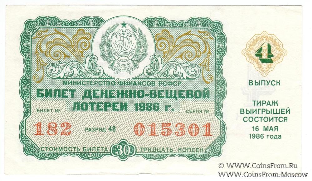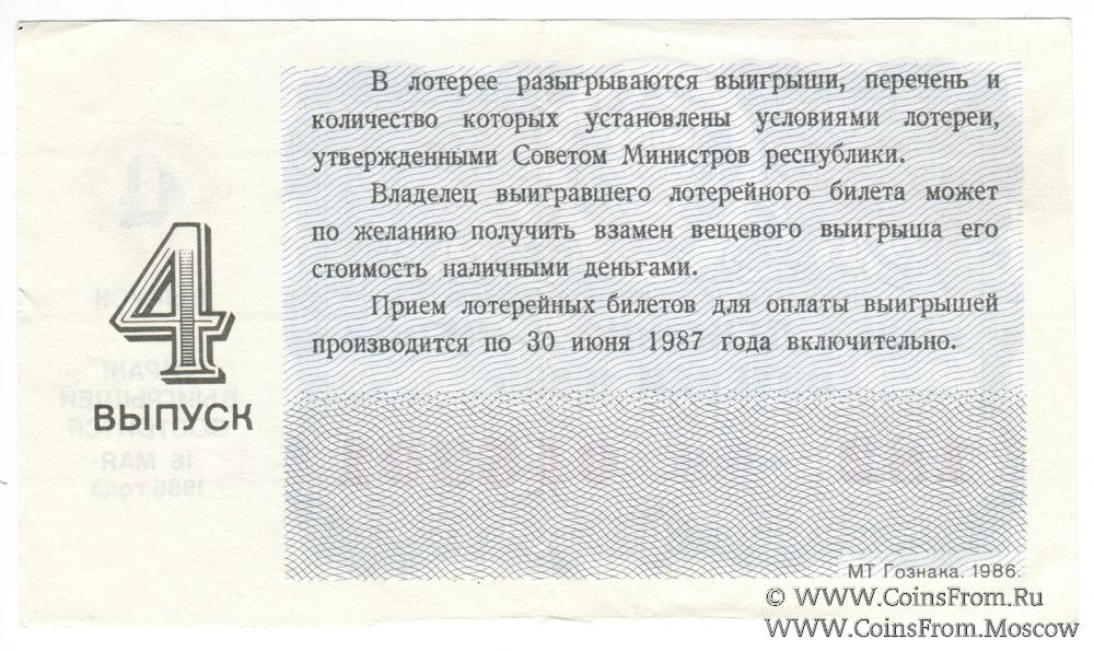 Билет. Выпуск 4. Денежно-вещевая лотерея 1986 г.