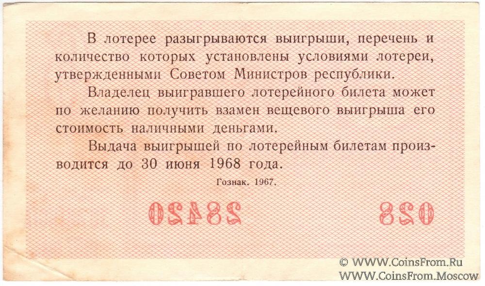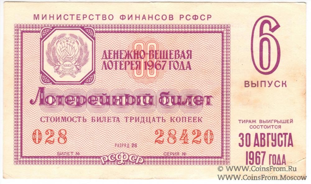 Лотерейный билет. Выпуск 6. Денежно-вещевая лотерея 1967 г.