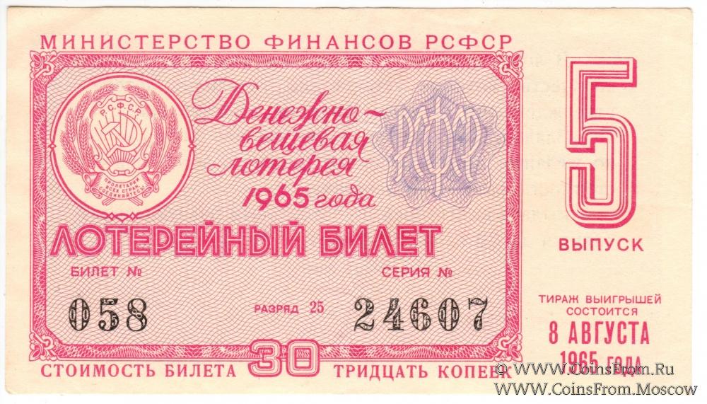 Лотерейный билет. Выпуск 5. Денежно-вещевая лотерея 1965 г.