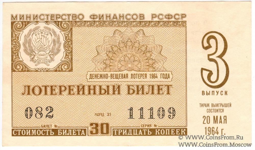 Лотерейный билет. Выпуск 3. Денежно-вещевая лотерея 1964 г.