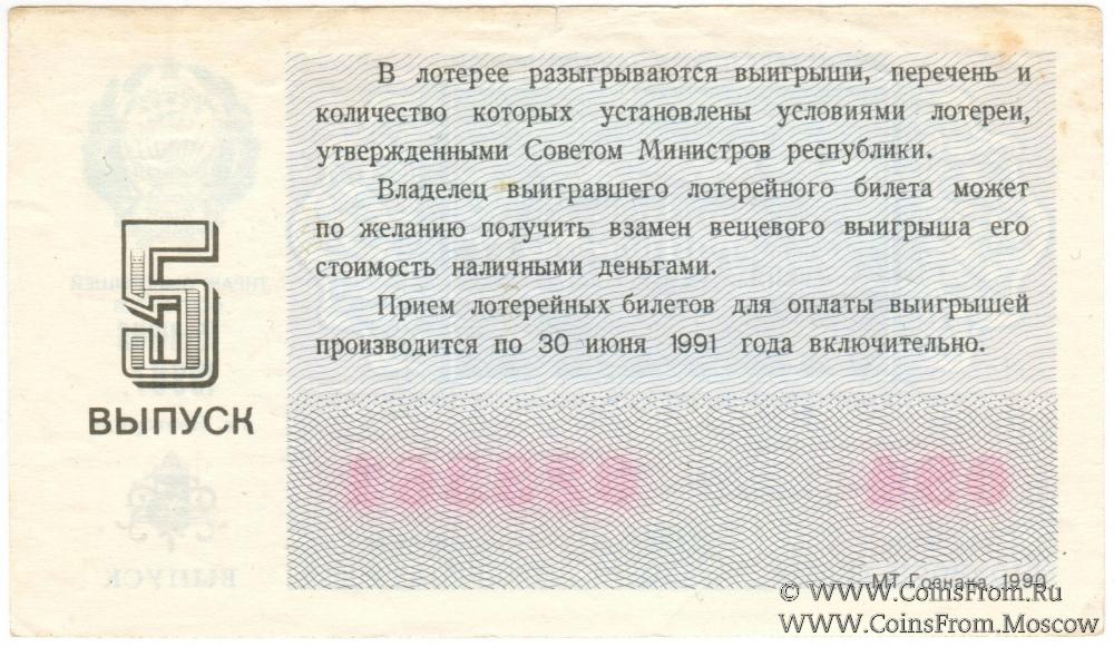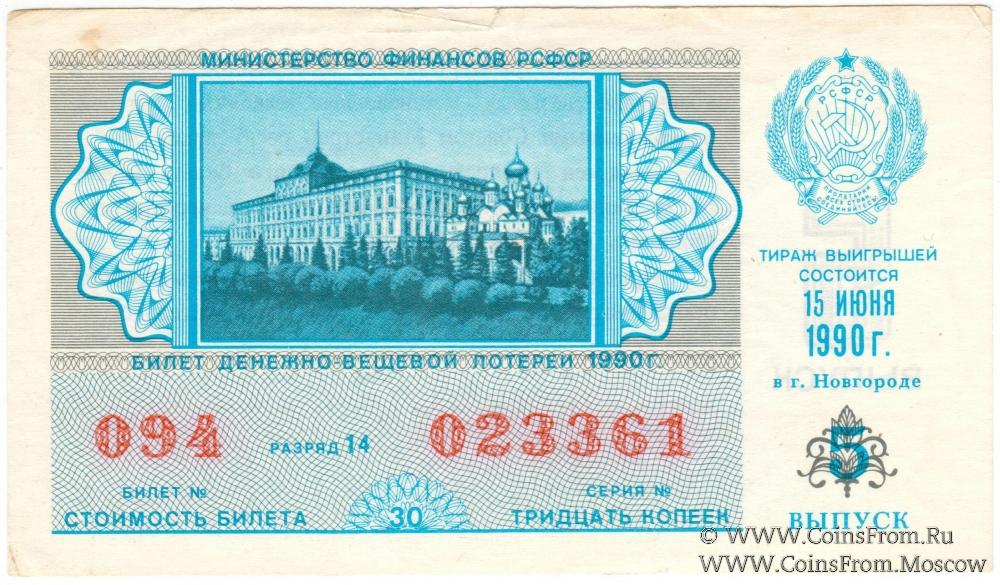 Билет. Выпуск 5. Тираж в г. Новгороде. Денежно-вещевая лотерея 1990 г.