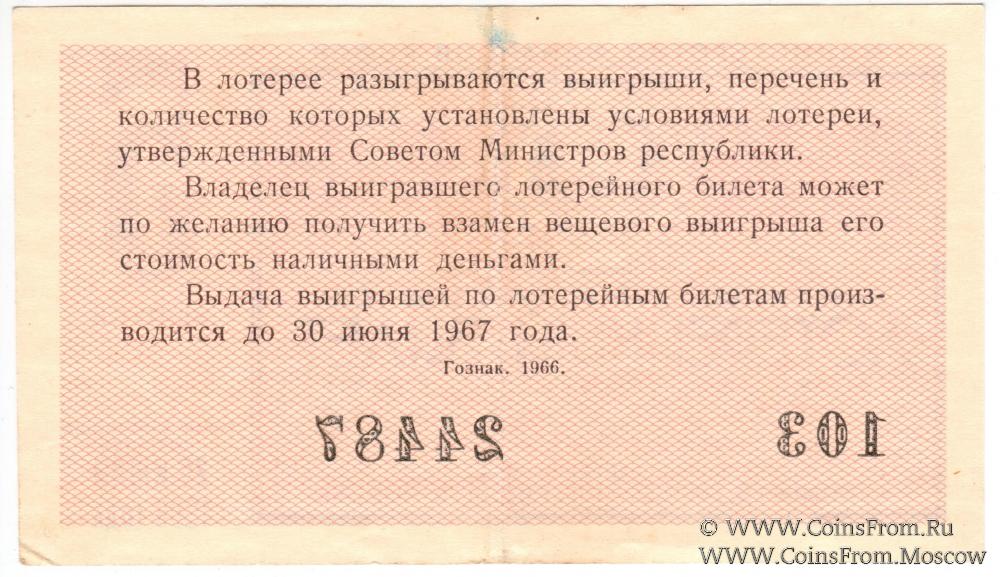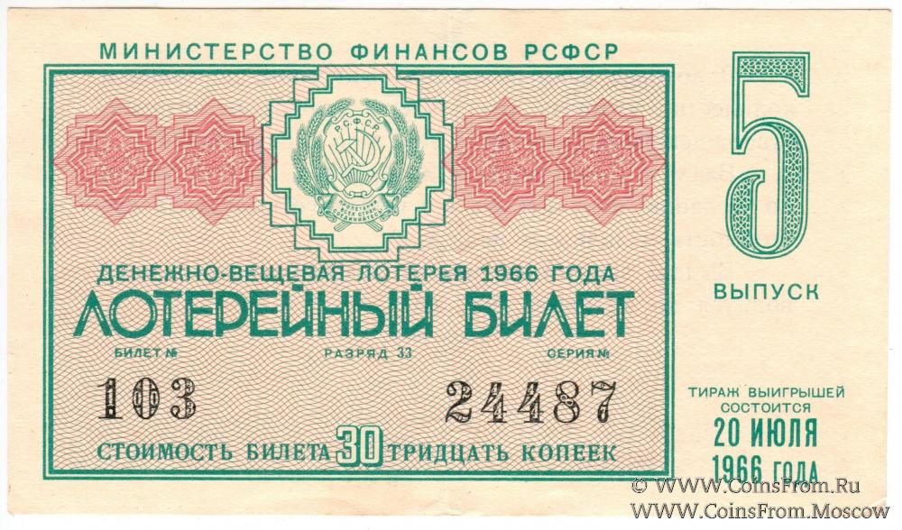 Лотерейный билет. Выпуск 5. Денежно-вещевая лотерея 1966 г.