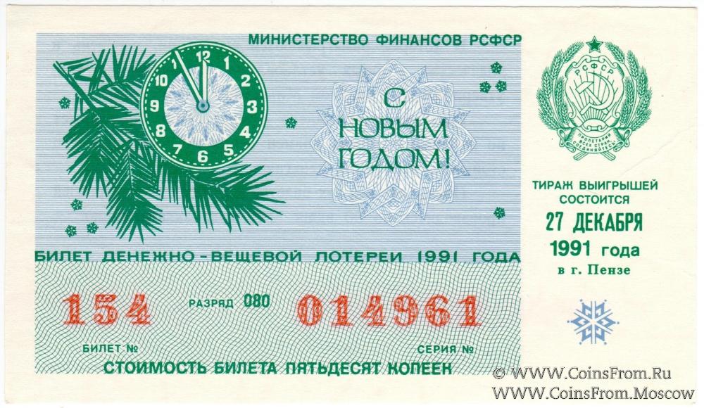 Билет. Новогодний выпуск. Тираж в г. Пензе. Денежно-вещевая лотерея 1991 г.