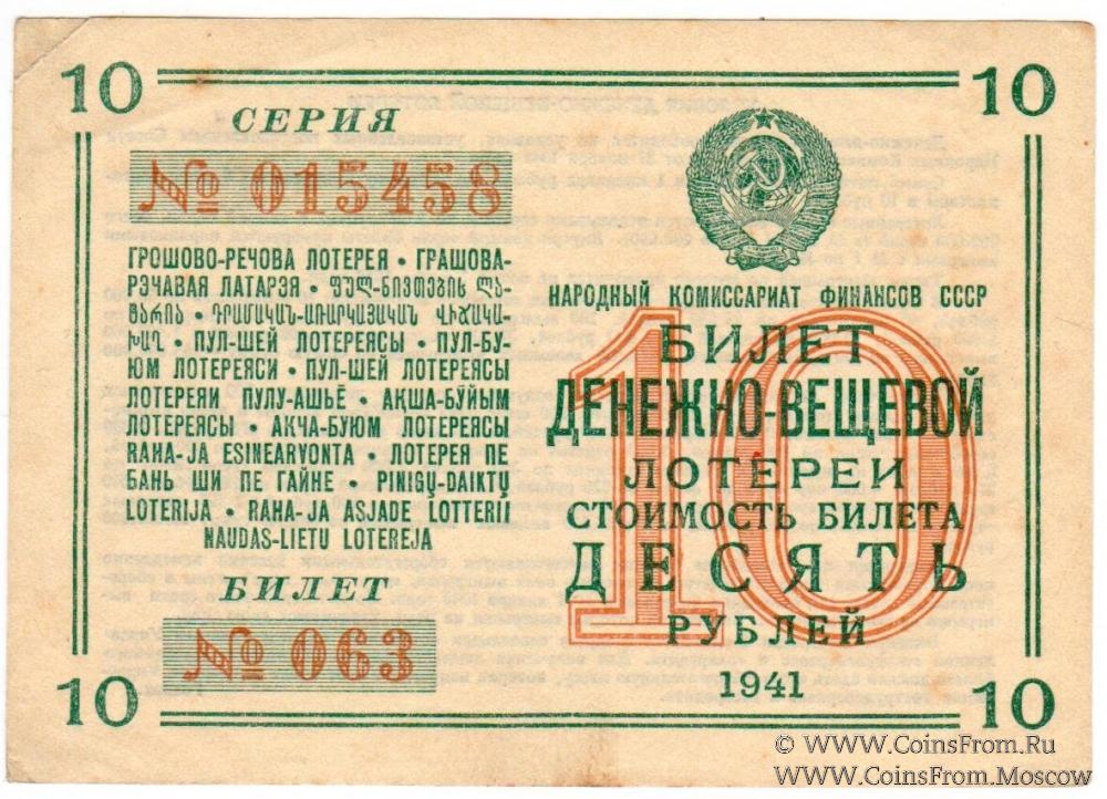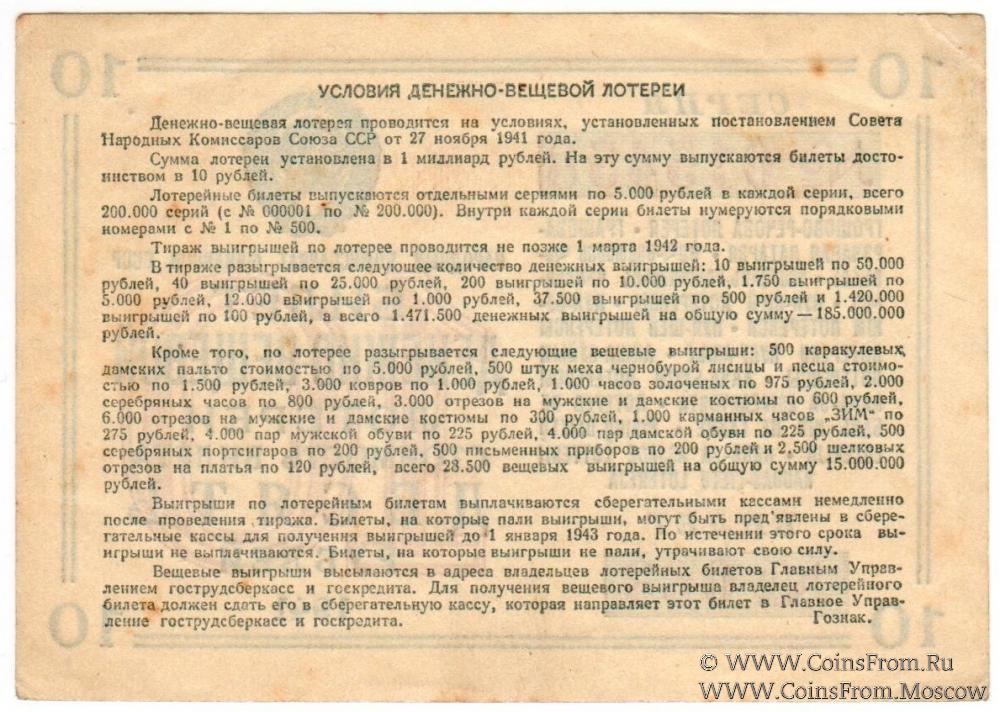 Билет. Серии 000001-280000. Водяной знак - волны горизонтальные. Денежно-вещевая лотерея 1941 г.