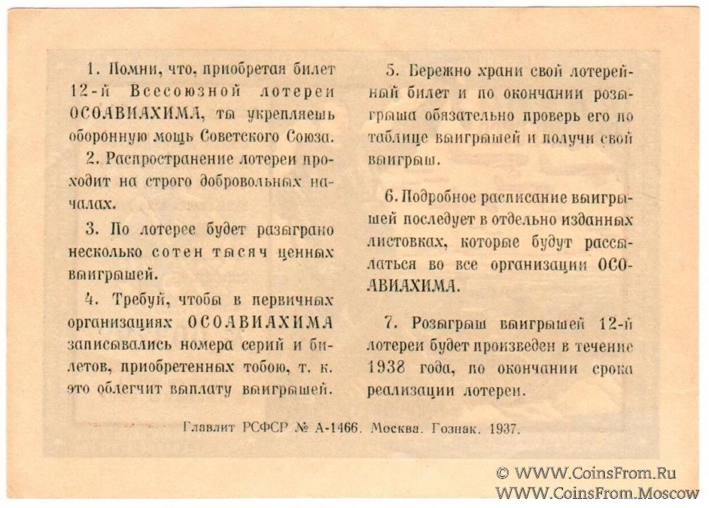 Билет. Водяной знак. Разряды I-XXVII. 12-я Всесоюзная лотерея 1937 г.