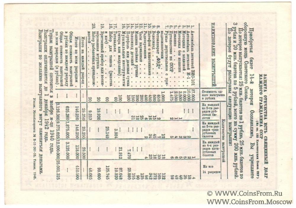 Билет. Оранжевый. Разряды I-V. 14-я Всесоюзная лотерея 1940 г.
