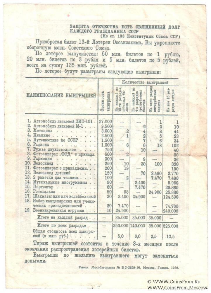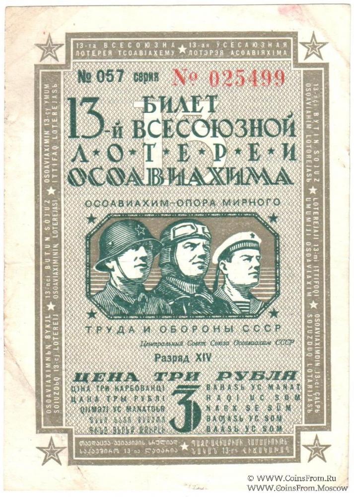 Билет. Серо-коричневый. Разряды XI-XIV. 13-я Всесоюзная лотерея 1939 г.