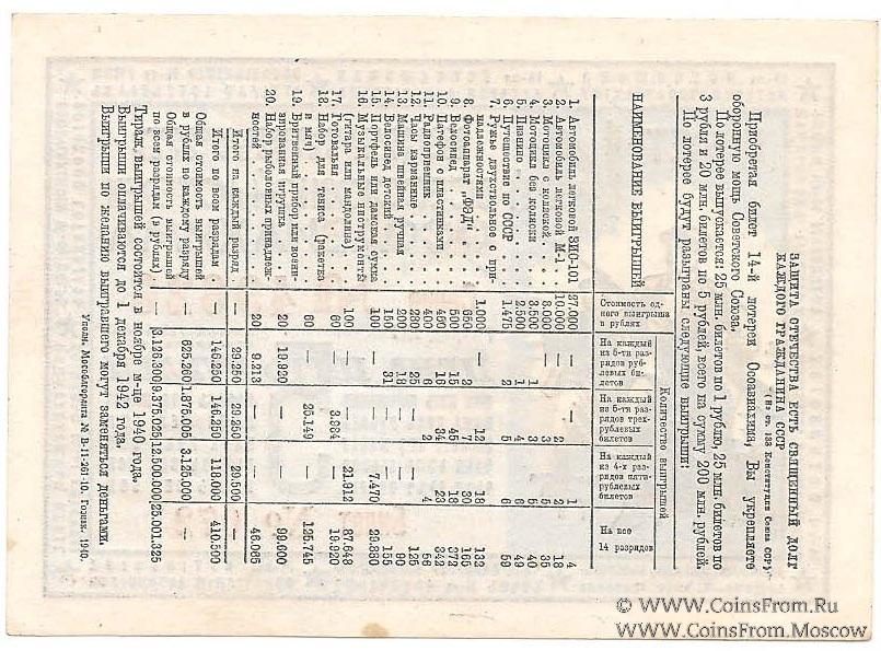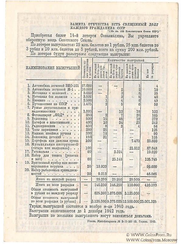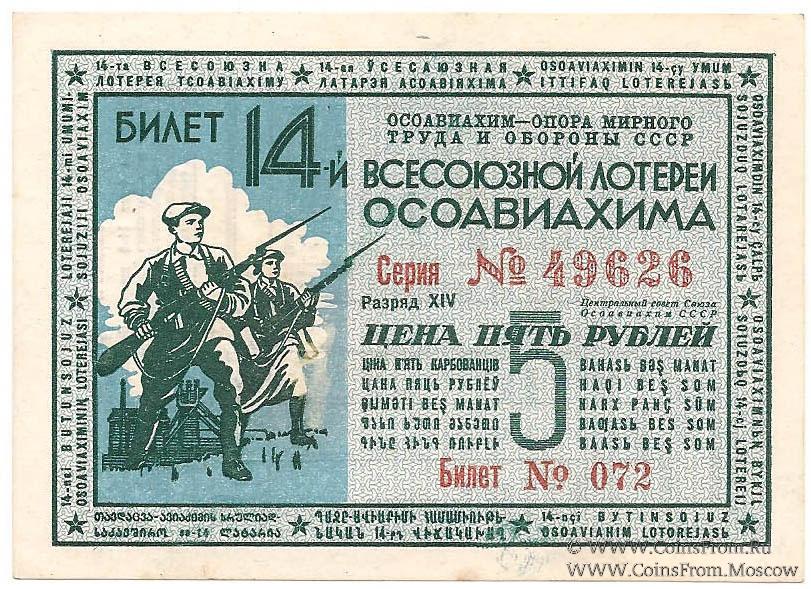 Билет. Голубой. Разряды . 14-я Всесоюзная лотерея 1940 г.