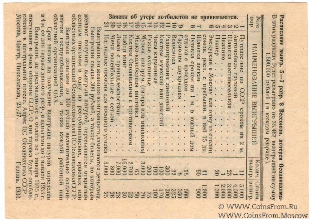 Билет. Синий оттенок. Водяной знак. Разряды 1-7 (1933 г.). 8-я Всесоюзная лотерея 1933-1934 гг.