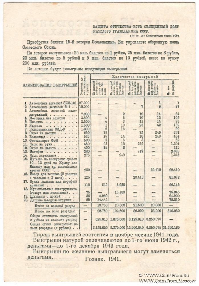 Билет. Бежевый фон, коричневый текст. Разряд XV. 15-я Всесоюзная лотерея 1941 г.