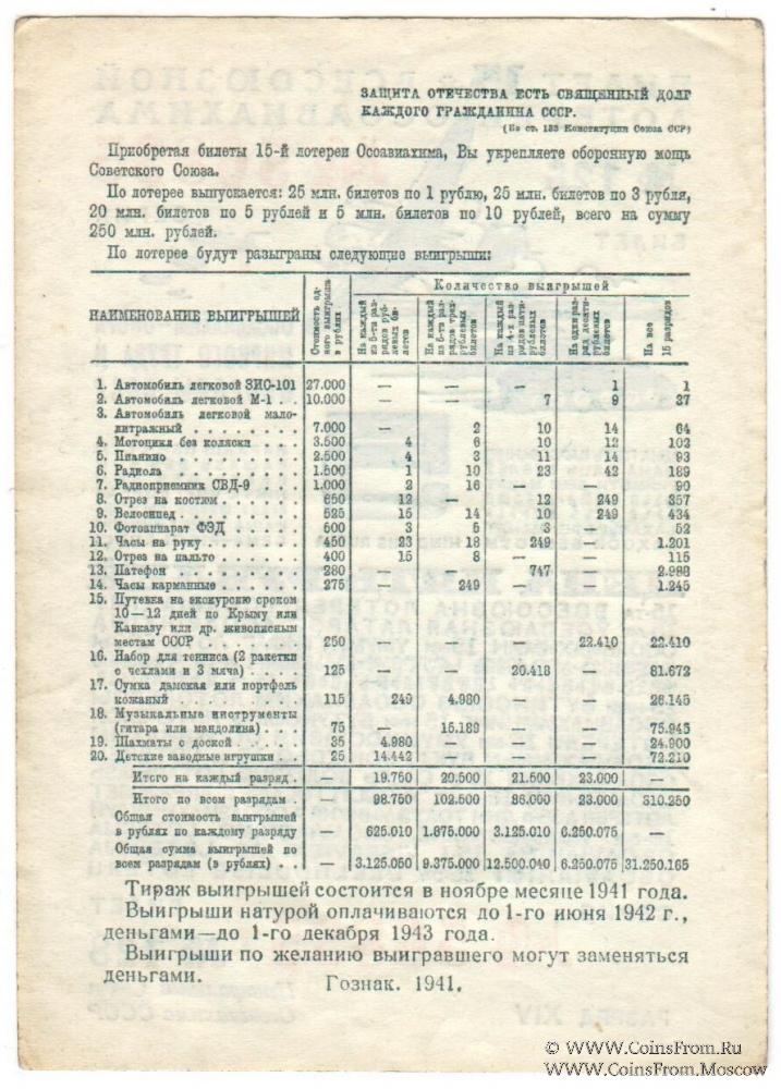 Билет. Голубой фон, синий текст. Разряды XI-XIV. 15-я Всесоюзная лотерея 1941 г.