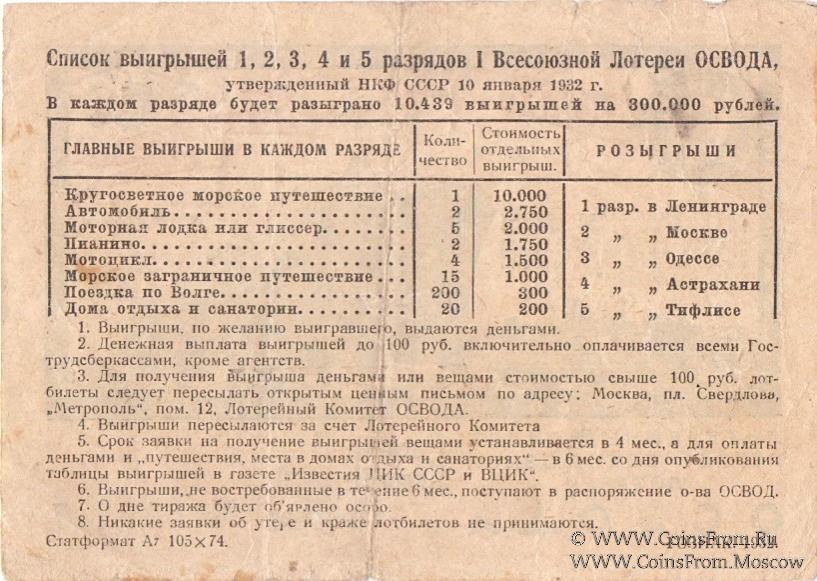 Лотерейный билет. Разряд 3 - Одесса. 1-я Всесоюзная лотерея.