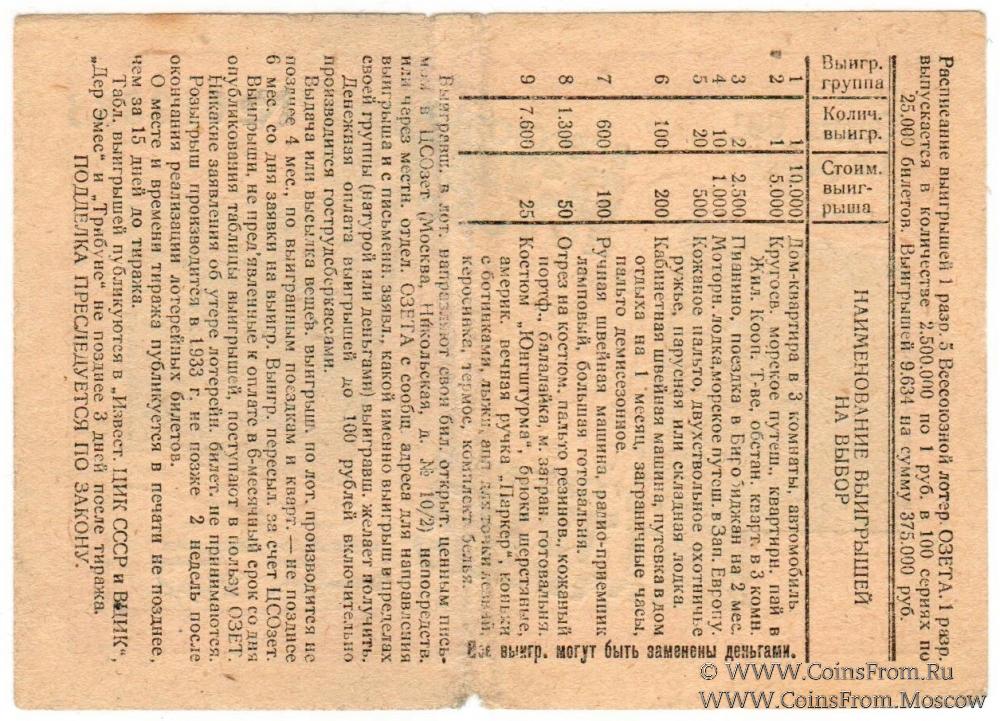 Билет без даты. Серии 001-100. 5-я Всесоюзная ОЗЕТ-лотерея 1933 г.