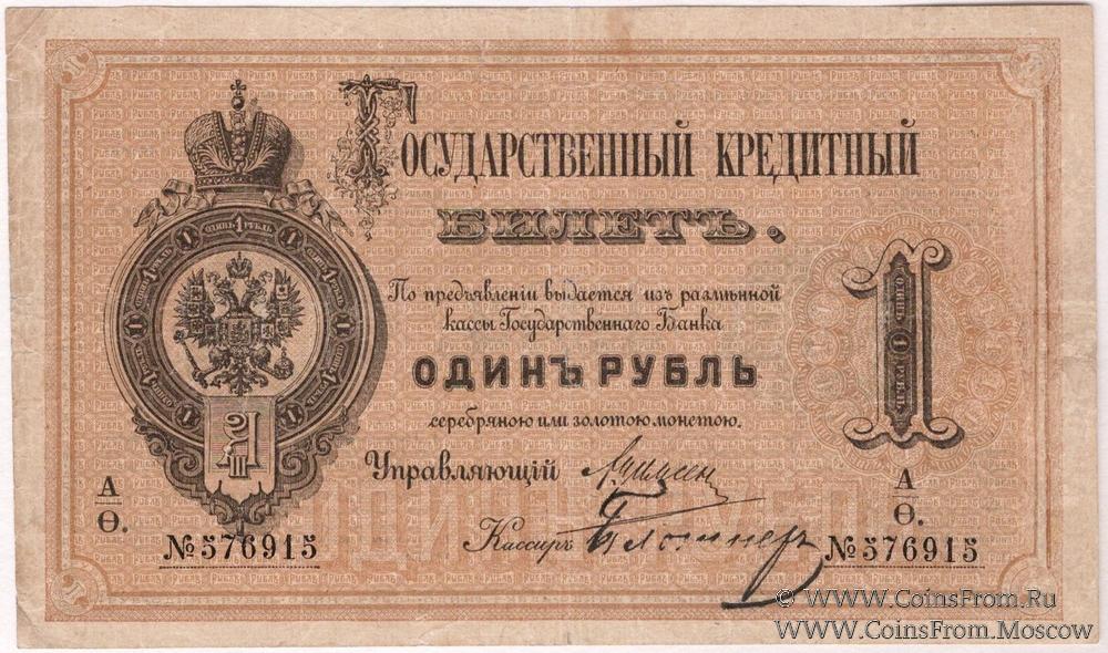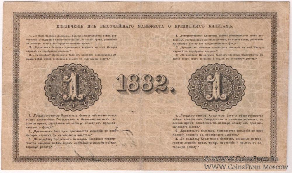 Водяной знак: Сложный рисунок в виде четырехсторонней фигурной рамки. По углам, в окружностях — цифра 1. Сверху — буквы Г. К. Б. В центре, в прямоугольной рамке — надпись: ОДИН РУБЛЬ, ниже — год выпуска (1882).