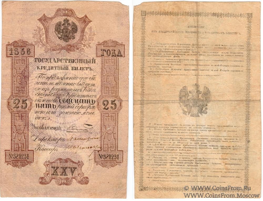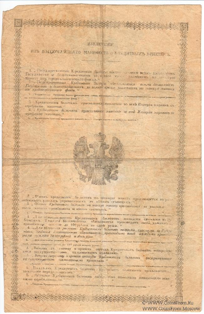 Государственные кредитные билеты выпущены на основании Высочайшего Манифеста № 16903 от 1 июня 1843 года "О замене ассигнаций и других денежных представителей кредитными билетами". Имели свободное хождение наравне с серебряной монетой. Выпускались до 1865 г. Окончательный срок обмена на кредитные билеты новых образцов - 1 января 1876 г.