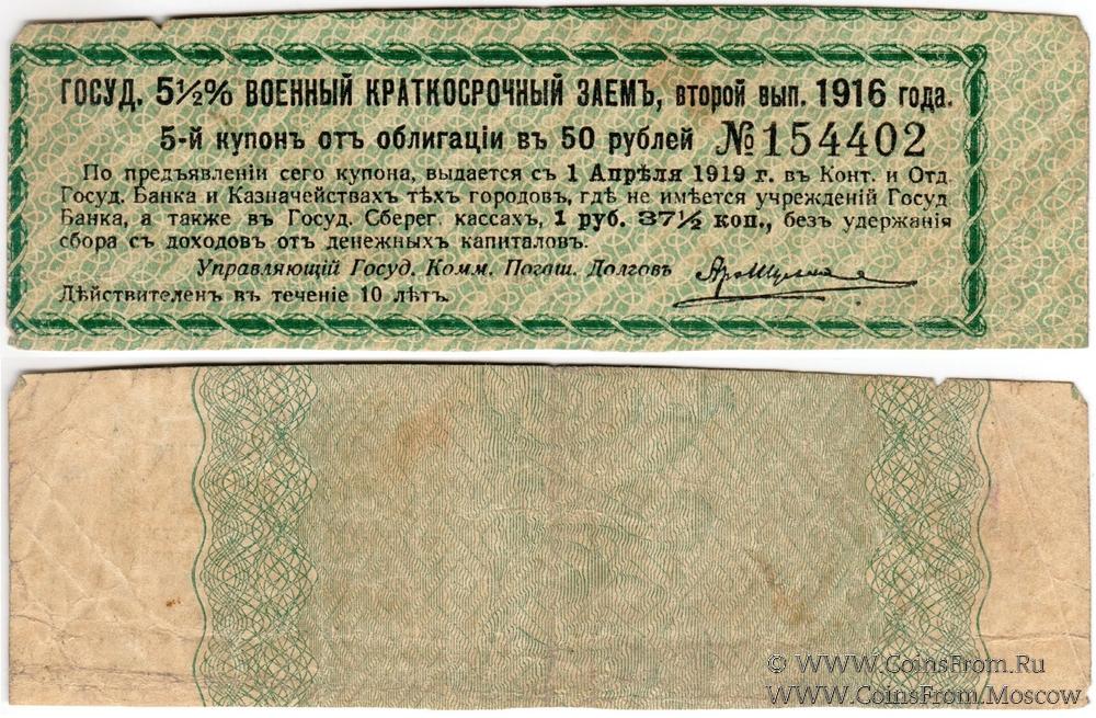 5-й Купон Государственного 5 1/2% Военного Краткосрочного Займа, второй выпуск 1916 года, от облигации в 50 рублей.