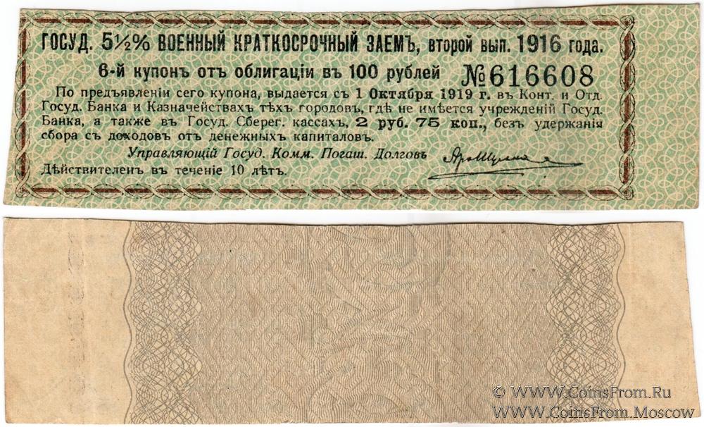 6-й Купон Государственного 5 1/2% Военного Краткосрочного Займа, второй выпуск 1916 года, от облигации в 100 рублей.