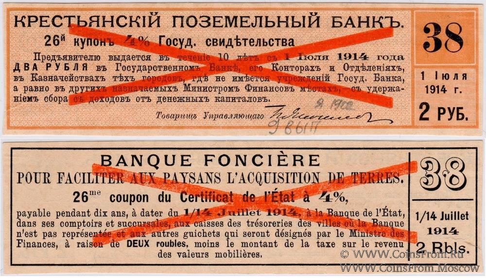 ОБРАЗЕЦ. Купон № 26. Контрольный № 38. 9-й выпуск 1901 г. 2-й купонный лист. Купоны 4 % Государственных свидетельств Крестьянского Поземельного Банка.