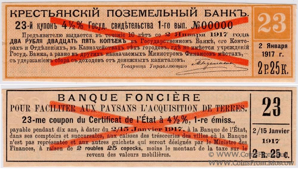 Купоны 4 1/2 % Государственных свидетельств Крестьянского Поземельного Банка.