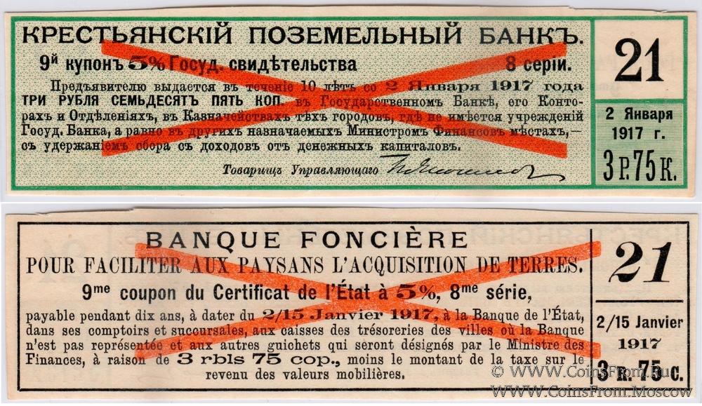 ОБРАЗЕЦ. Купон № 9. Контрольный № 21. 8-я серия 1913 г. 1-й купонный лист. Купоны 5 % Государственных свидетельств Крестьянского Поземельного Банка.