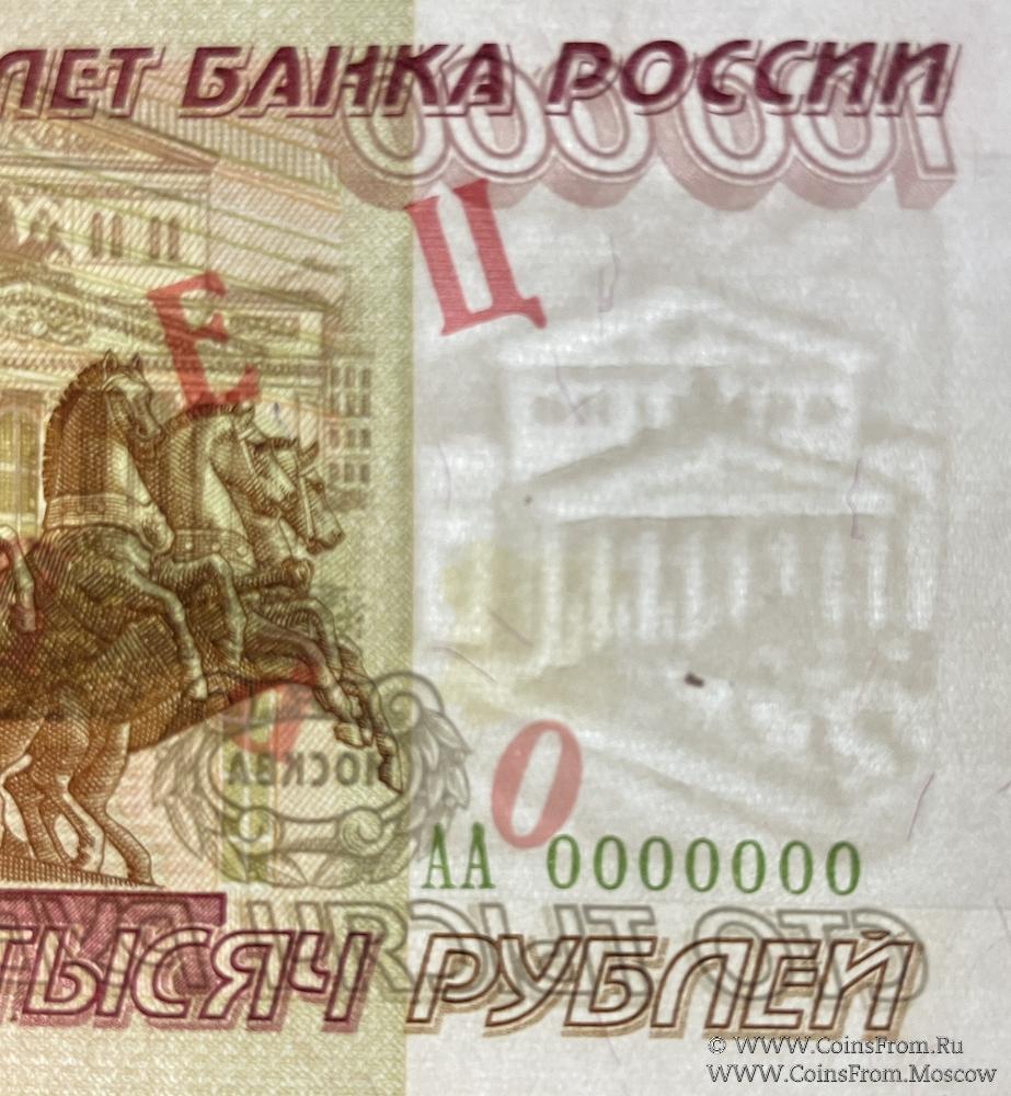 Билет Банка России образца 1995 г. Диагональная надпечатка красного цвета "ОБРАЗЕЦ" на аверсе и реверсе. Водяной знак - Большой театр в Москве (на широком купонном поле), номинал "100000" (на узком купонном поле). Центральный Банк России. ГОЗНАК.