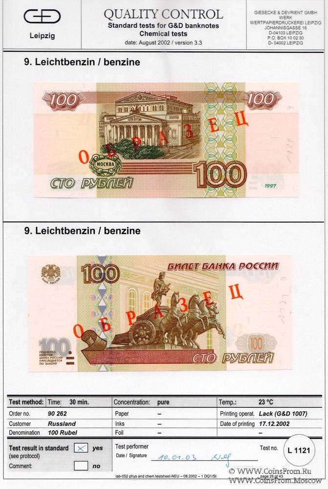 Образцы данного типа отпечатаны без номера и серии и являются экспериментальными. Например, представленные проходили проверку качества билета химическим тестом (погружались в бензин). В результате эксперимента никаких видимых изменений и повреждений на билете нет, что подтверждает качество печати ГОЗНАКа, а пометки, сделанные от руки на аверсе и реверсе, при этом обесцветились. Испытания банкнот проводила немецкая компания Giesecke & Devrient (G&D), которая специализируется на печати банкнот и ценных бумаг, а также на производстве смарт-карт. Точное количество оставшихся после эксперимента банкнот неизвестно, в связи с чем представленне образцы являются редкими, если не сказать уникальными.