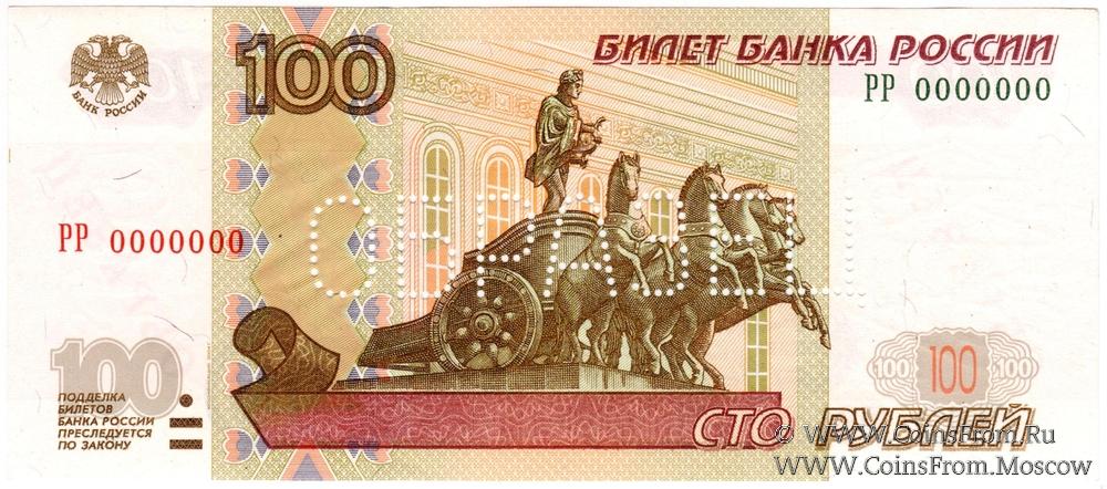 ОБРАЗЕЦ (двусторонний): горизонтальная перфорация слова "ОБРАЗЕЦ"; диагональная надпечатка красного цвета "ОБРАЗЕЦ" дважды на реверсе. Серия РР. Тип серии "ХХ". ГОЗНАК.