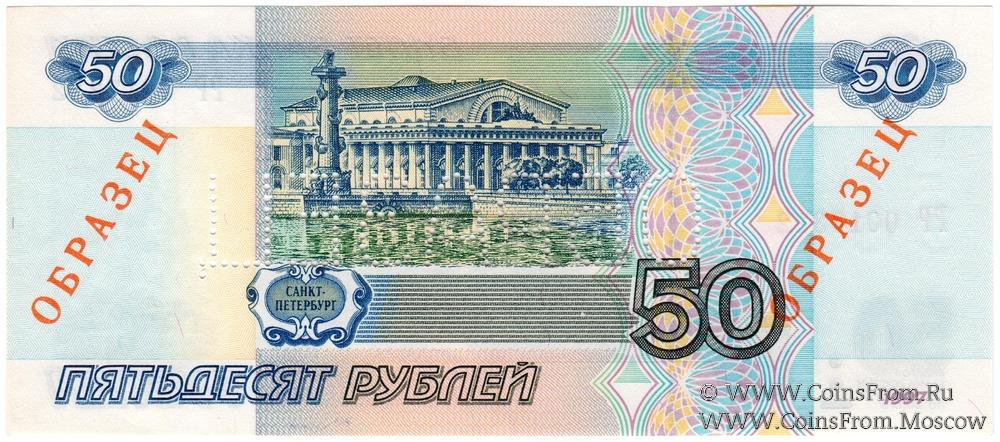 ОБРАЗЕЦ (двусторонний): горизонтальная перфорация слова "ОБРАЗЕЦ"; диагональная надпечатка красного цвета "ОБРАЗЕЦ" дважды на реверсе. Серия РР, номер произвольный. Тип серии "ХХ". ГОЗНАК.