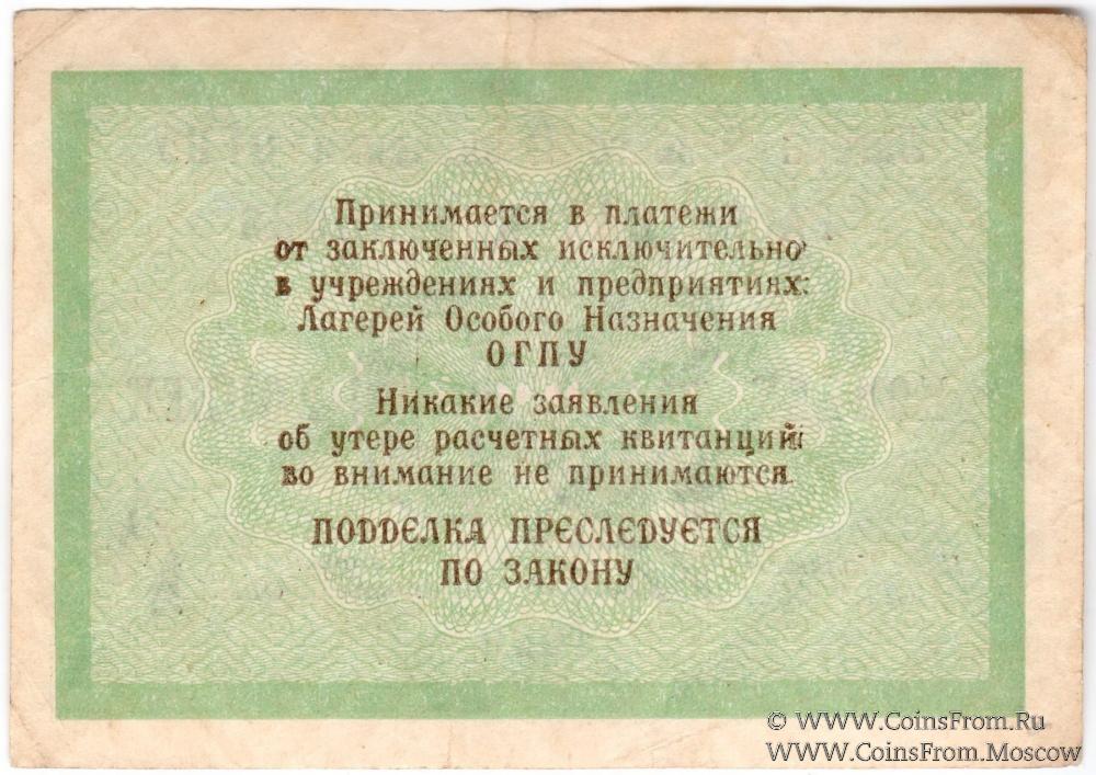 Расчетная квитанция. 1 выпуск. Подпись Бокий. Водяной знак - окна. Лагери Особого Назначения ОГПУ. Типография ГОЗНАК.