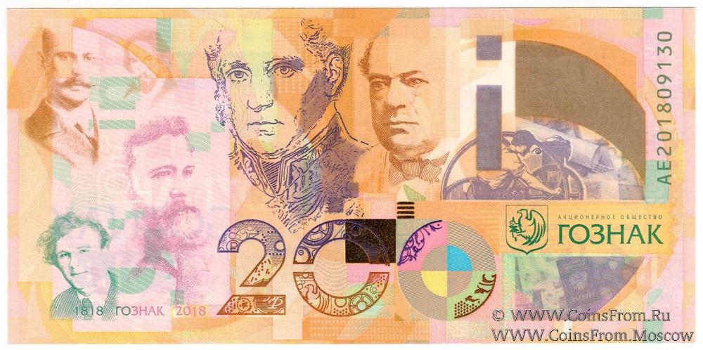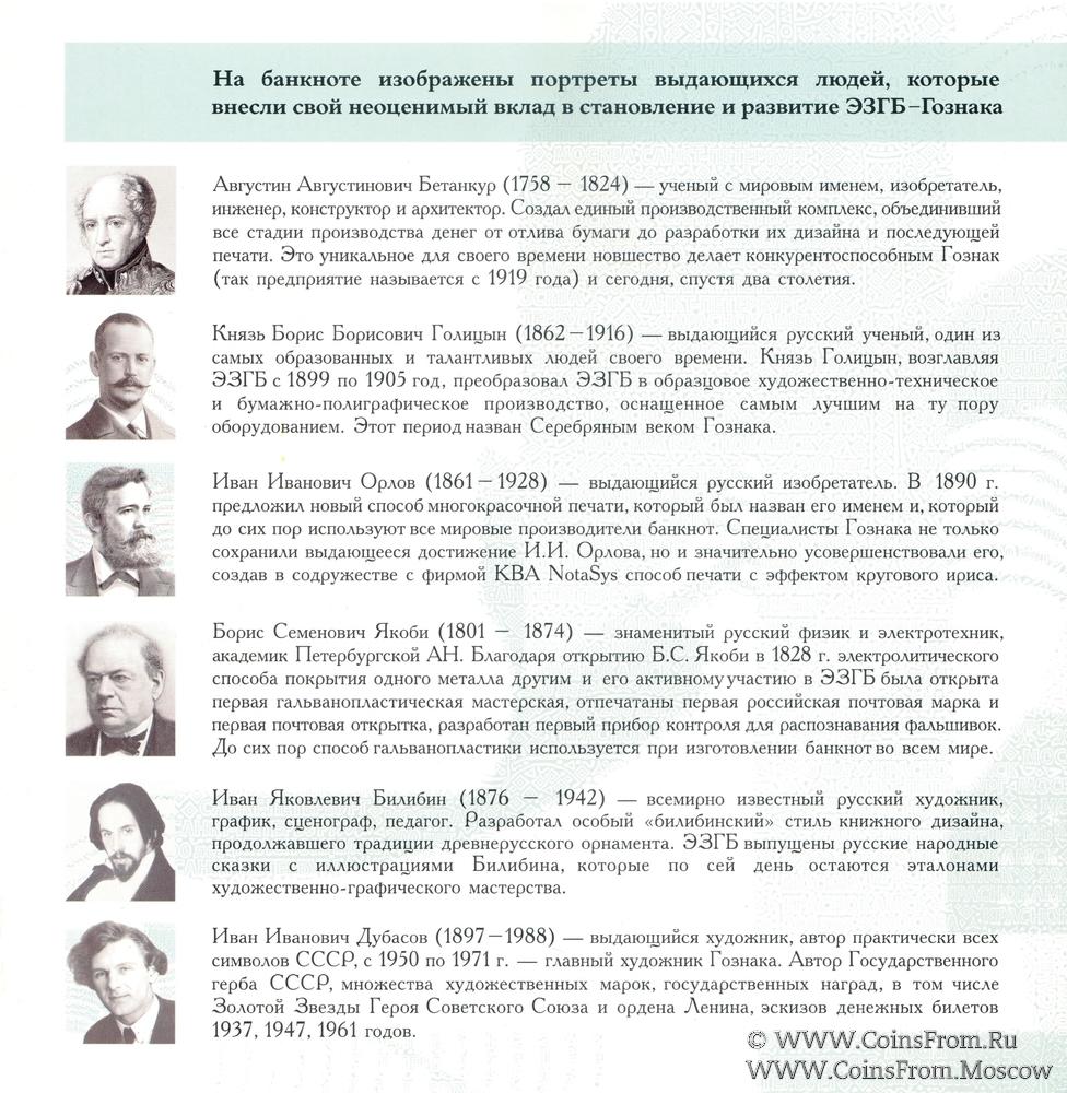 На банкноте изображены портреты выдающихся деятелей организации, а также исторический процесс печати денежных знаков.