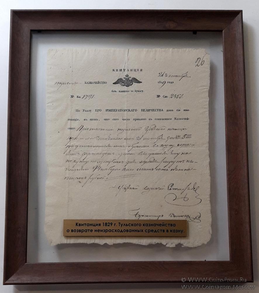 Квитанция 1829 г. Тульского Казначейства о возврате неизрасходованных средств в казну.