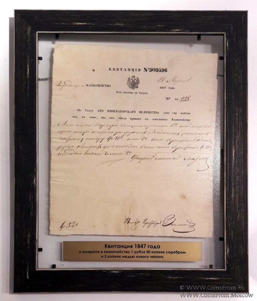 Квитанция 1847 г. Казначейства о возврате в казну 1 рубля 50 копеек серебром и 2 копеек медью нового чекана.