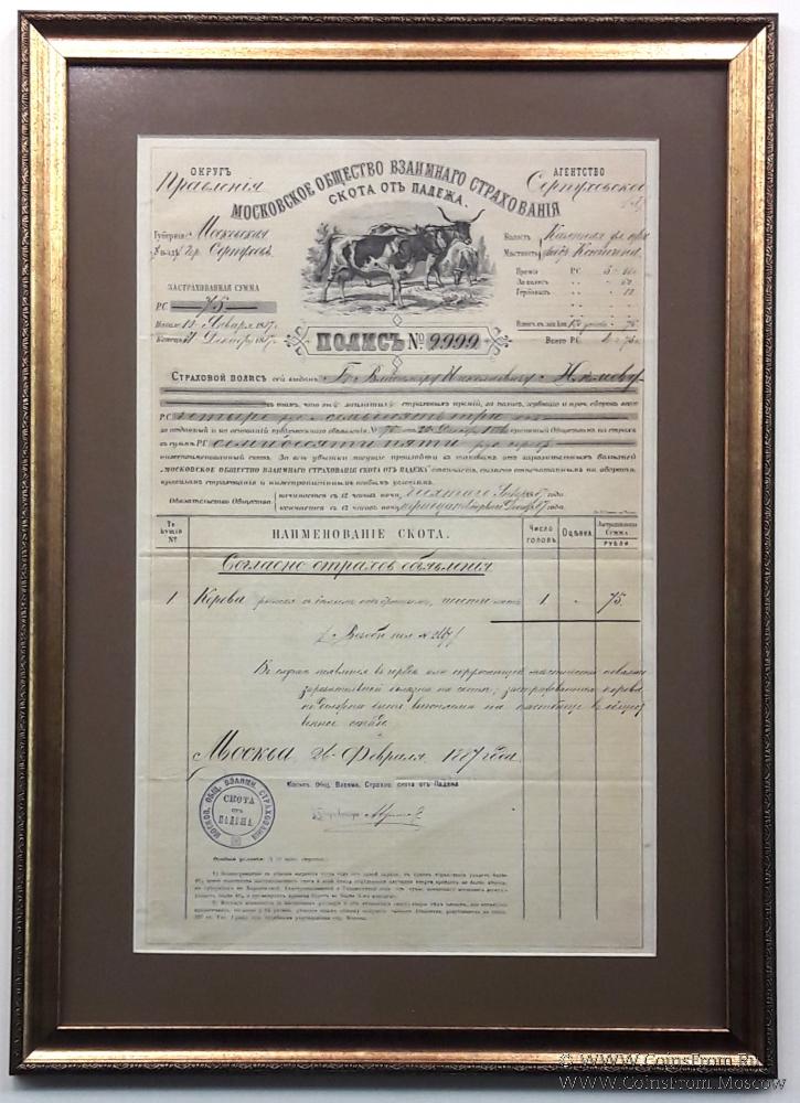 Полис Московского общества взаимного страхования скота от падежа № 2999 от 26.02.1887 г. выдан на имя Владимира Николаевича Нюмова.